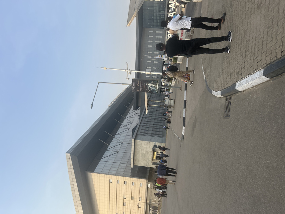 The image captures an outdoor scene at the Murtala Muhammed International Airport (MMIA) in Lagos, Nigeria, under a clear, light blue sky during daytime