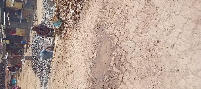 This image depicts an outdoor scene in an informal settlement, consistent with areas such as Kibera or Mathare in Nairobi, Kenya. The foreground consists of unpaved, light brown earth, exhibiting multiple tire tread marks and a shallow, irregular muddy puddle in the lower left quadrant. In the middle ground, two adult males are engaged in what appears to be excavation or construction activity. The individual on the left, wearing a light blue/grey t-shirt and dark trousers, is bent over, facing away from the camera, and working within a partially excavated trench containing loose rubble. A grey concrete post stands upright within this trench. The individual on the right, wearing a multi-colored patterned shirt and dark trousers, stands upright, facing to the left, adjacent to the excavated area. A bright yellow hose or pipe runs through the trench and across the disturbed ground. To the right of the trench, a pile of rubble supports a light blue container. The background is densely packed with numerous single-story, makeshift structures primarily constructed from corrugated metal sheets, some painted in shades of yellow, red, and brown. These structures feature small windows or openings. Laundry lines with clothing are visible between some buildings. A person in a red garment is partially visible on the far left background, appearing to be on a motorcycle moving away. The scene is illuminated by natural daylight.