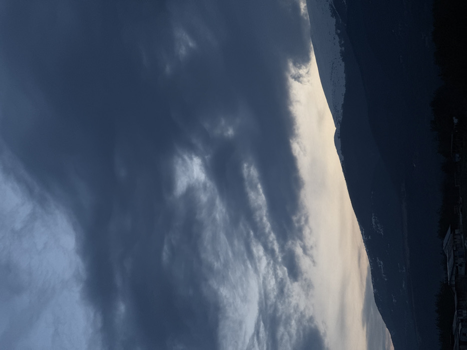 The image displays a mountainous landscape in Bistritsa, Bulgaria, under an overcast sky. The upper two-thirds of the frame are dominated by dark, dense bluish-grey cloud formations. Below the clouds, a narrow band of lighter sky, exhibiting pale yellow and grey tones, is visible along the horizon. Two distinct mountain ridges occupy the lower portion of the scene. The more distant, higher ridge, visible on the right, features snow cover on its upper slopes. The closer, lower ridge and the immediate foreground are largely silhouetted in dark tones. In the bottom-left corner, several low-lying, indistinct structures, consistent with buildings, are partially visible amidst dark vegetation. No individuals, actions, or specific interactions are identifiable within the scene. The overall illumination suggests either dawn or dusk.