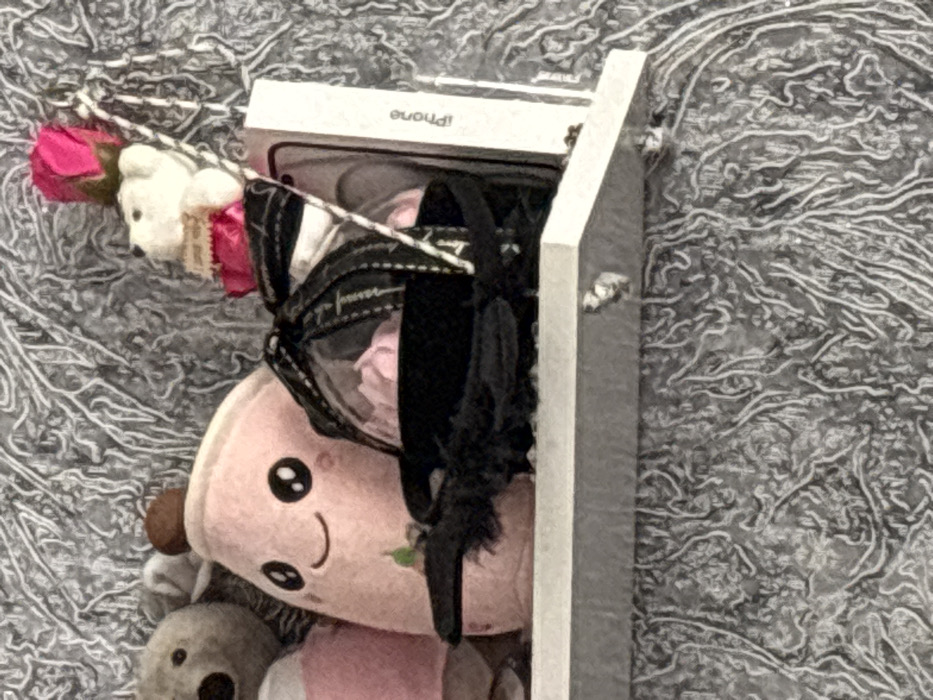 The scene depicts a static arrangement of decorative objects and a retail product on a white floating shelf, likely in an interior setting within Slavyanovo, Bulgaria. The background is a textured wall, predominantly grey, featuring an organic, raised pattern. On the shelf, from left to right, a portion of a light-colored spherical plush toy is visible, followed by a pink boba tea-shaped plush toy with a smiling embroidered face and a brown topping. Next to this is a clear, cylindrical container adorned with a black ribbon bow, holding light pink, petal-like items. A black, possibly feathered, accessory lies in front of this container. To the right, a white iPhone retail box is positioned vertically. Above the iPhone box, a small white teddy bear holding a pink object is seen, surmounted by a single bright pink artificial rose, from which a thin white string extends upward and out of frame. No individuals are present, and no activity is observed.