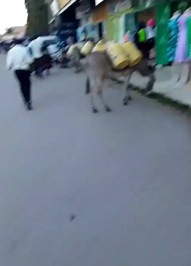 street scene in what appears to be a small town or village. Several donkeys are walking down the street, each carrying two large yellow containers on its back. A few people are walking in the same direction as the donkeys. There are buildings on either side of the street, some of which appear to be shops. Several vehicles are parked along the side of the road. The lighting suggests it is either early morning or late afternoon. The overall impression is a busy street scene in a developing country.
