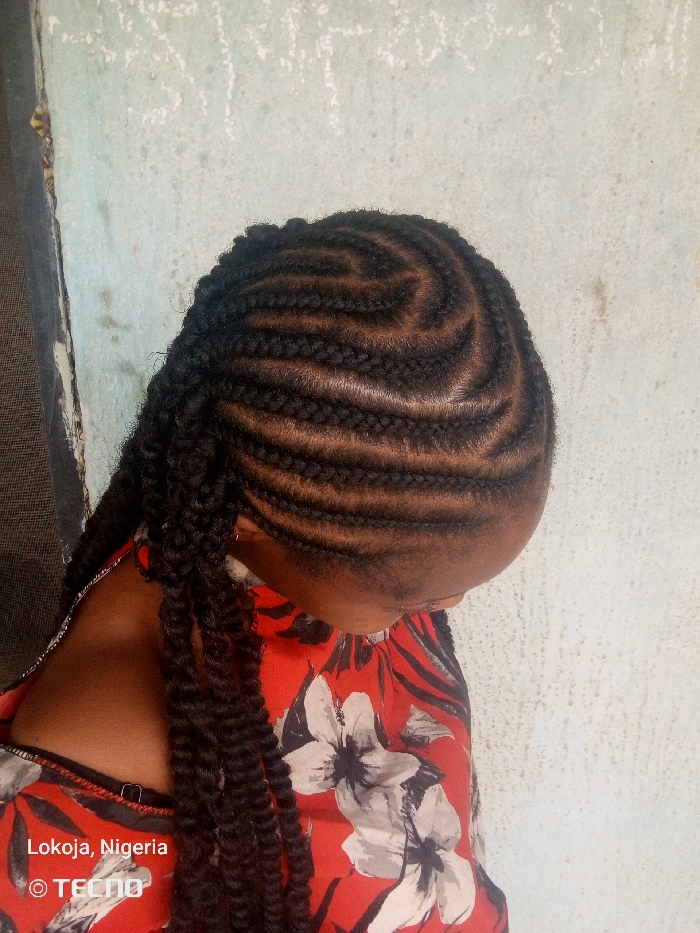A woman’s head displays intricate cornrow braids that curve into a spiral pattern on top