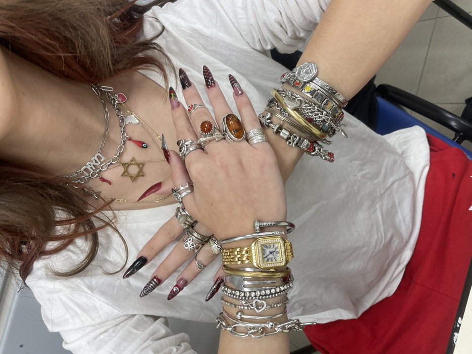 A person is depicted from the upper torso, showcasing their heavily adorned hands, wrists, and neck against a light-colored indoor background, with a dark blue chair back partially visible on the right