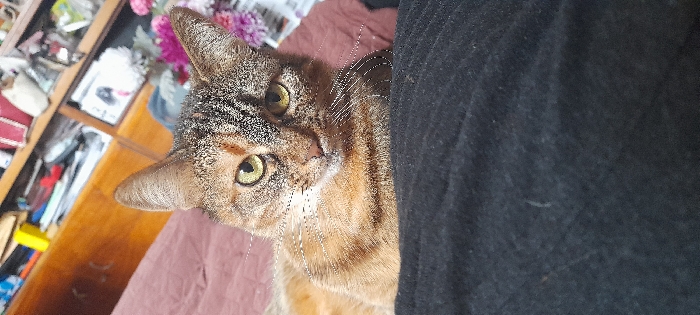 A domestic shorthair cat with calico or tortoiseshell tabby fur, featuring brown, orange, and dark grey-black markings, occupies the upper half of the frame. Its eyes are green-yellow, and white whiskers are prominent. The cat is positioned with its head slightly tilted, looking directly forward, resting on a reddish-brown textured fabric, likely bedding. The lower portion of the image shows a dark, possibly black or dark grey, fabric surface, consistent with clothing or a blanket, obscuring the cat's lower body. In the background, to the left, a light brown wooden furniture piece is visible. To the right, a cluttered shelf or open cabinet unit contains various indistinct objects, including what appears to be a yellow box and other miscellaneous items. Vibrant pink and purple artificial flowers or decorative elements are partially visible on the far right. The scene is an indoor setting within the city of Karnobat, Bulgaria.