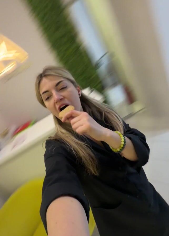 A fair-skinned woman with long blonde hair wearing a black blouse stands indoors, in what appears to be a salon or office. She is holding and eating a small, tan-colored, irregular-shaped object, possibly a cookie or cracker. The camera, which is being held at arm's length by the woman, captures her face and upper body. In the background, there is a white reception desk with a golden letter "A" sign, various decorative items, including plants, yellow chairs, and light-colored walls. She makes a peace sign. The lighting is bright. There is background music.