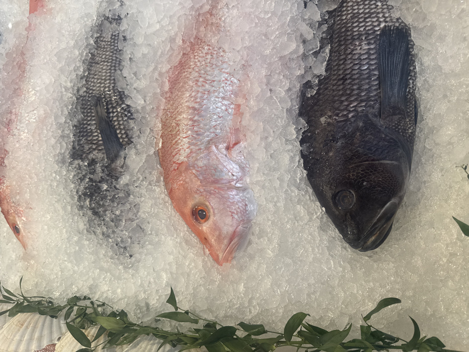 n overhead view of four whole fish displayed on a bed of crushed ice. The fish are arranged vertically, head-to-toe. From left to right, the fish display colors of off-white, grey, light-red, and black. The fish are surrounded by bright white ice. Green leafy stems and small white shells accent the bottom of the frame.