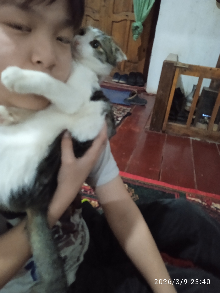 This image depicts an indoor scene in Khujayli, Uzbekistan, recorded at 23:40 on March 9, 2026. A partially visible individual is holding a small domestic cat. The individual, wearing a light-colored top, supports the cat with their left hand and has their right arm around its body. The lower portion of the individual's face is visible, with their right arm also in frame. The cat, a mix of white and grey/tabby markings, has its head turned towards the individual's face, with its front paws resting near the individual's neck/shoulder area. The background features a reddish-brown wooden floor, partially covered by a patterned rug containing dark green, red, and gold elements. A wooden door or paneling is visible on the left, beside which multiple dark-colored shoes and a blue container are present on the floor. A piece of green fabric hangs in the upper left background. A wooden furniture piece, possibly a chair or table frame, is situated on the right side of the frame, containing dark objects within its structure. The scene is illuminated by artificial indoor lighting.