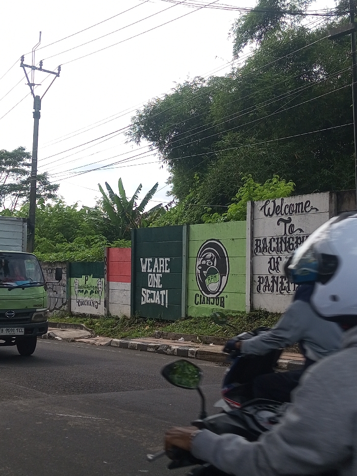 A street scene shows a green vehicle passing by a wall adorned with graffiti and murals. A motorcyclist with a white helmet drives on the road. The wall features the Indonesian flag, a slogan "WE ARE ONE SEJATI," and a circular logo with "RPM CIANJUR." Further down, "Welcome To RACING" is written. Above the wall, lush greenery and power lines fill the sky. A utility pole stands tall on the left side of the image.