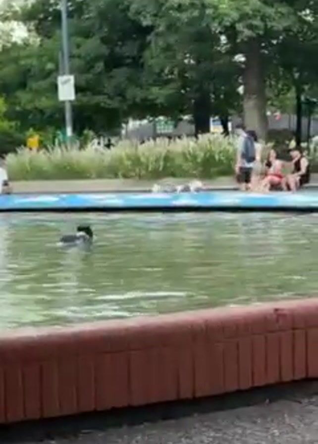 A medium shot shows a park with a circular fountain. The fountain has a brown brick edge and turquoise water. A black and white dog swims in the fountain, then exits and shakes off the water. Several people sit along the fountain's edge or nearby in the park. Lush green trees surround the area, with a cloudy sky above.