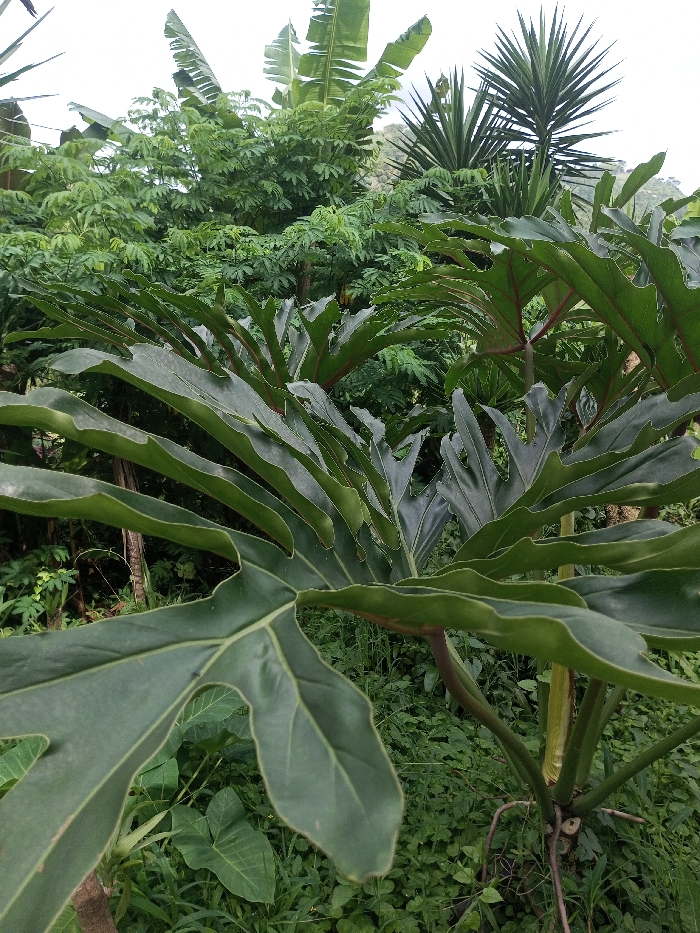 Lush, green vegetation fills the frame. Large, glossy split-leaf philodendron dominate the foreground, their broad, textured leaves creating a verdant canopy. In the background, a dense mixture of banana trees, cassava, and spiky yucca plants thrive. A diverse undergrowth of grass and smaller plants completes the tropical landscape, evoking a sense of untamed natural beauty.