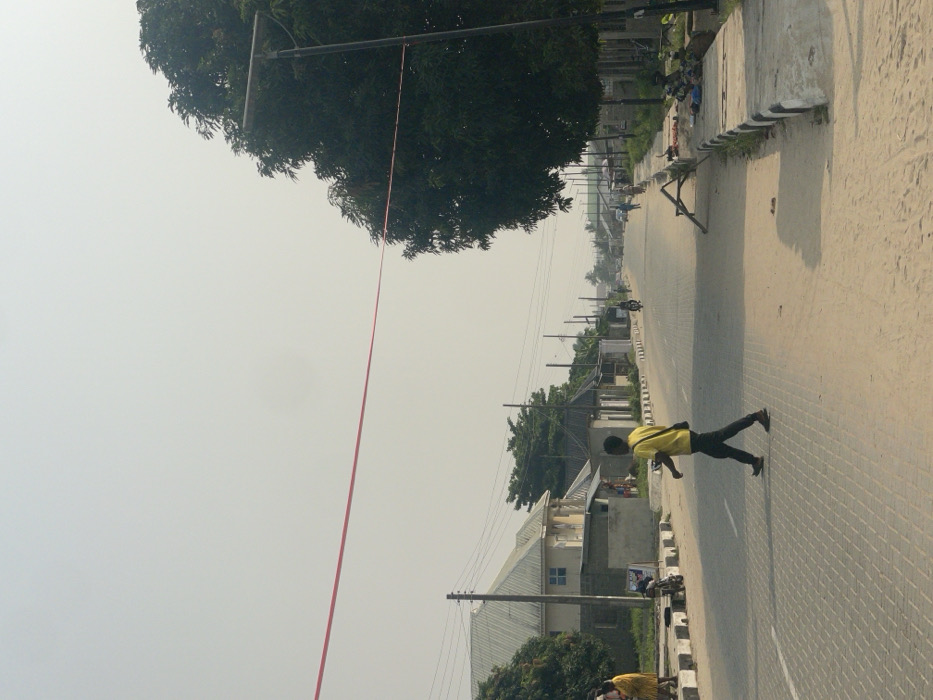 The scene depicts a street in Itoga, Nigeria, under a hazy, pale grey-blue sky. A paved two-lane road, possibly brick-patterned, features a broken white center line in the foreground. On the left side of the road, two individuals, one in a yellow garment, are partially visible standing on a dirt shoulder alongside a concrete curb. Behind them, a two-story house with a light-colored exterior and a silver corrugated metal roof is prominent, followed by smaller, single-story structures. Multiple utility poles with wires run along this side of the street. On the right side of the road, a man wearing a yellow t-shirt, dark trousers, and a dark shoulder bag is walking from left to right across the paved surface. Further down the right dirt shoulder, separated by a concrete curb, several individuals are present, with at least two seated next to what appears to be merchandise laid out for sale. A makeshift wooden barrier or support structure is positioned on this shoulder. A tall streetlamp equipped with a solar panel stands beside a large, dense green tree. A thin, horizontal red line, resembling a ribbon or cable, spans the upper portion of the image across the hazy sky, positioned approximately one-quarter down from the top edge. In the mid-distance on the road, a motorcyclist is visible traveling away from the camera. The street extends into the background, lined by additional buildings, utility poles, and trees, receding into the atmospheric haze.