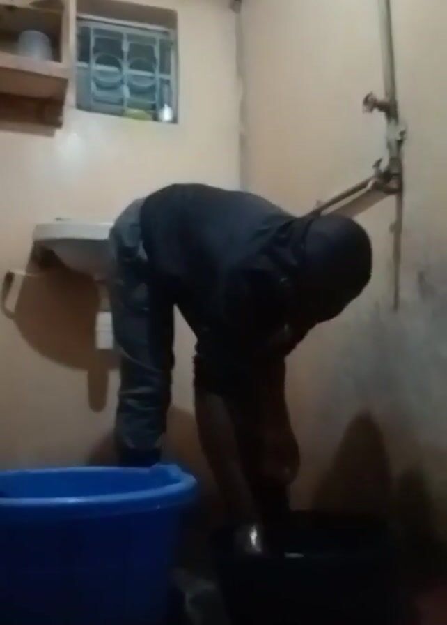 In a dimly lit bathroom with off-white walls, a person wearing a dark hooded sweatshirt and grey jeans is bent over, washing something in a black plastic tub. There's a blue plastic tub to the left. Behind the person is a white sink and a small barred window above it. A water pipe runs vertically along the right wall, with a faucet attached. The floor appears dark and slightly unclean.