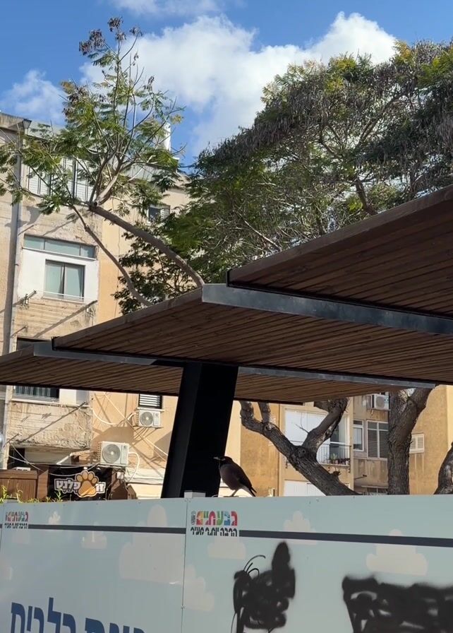 brown bird with a yellow beak sitting on top of a light blue construction hoarding. In the background, there are trees, apartment buildings, and a partly cloudy sky. The hoarding features graffiti and signs in Hebrew. Above the bird is a modern-style wooden structure with black metal supports, possibly a bus shelter. The camera zooms in slightly on the bird.