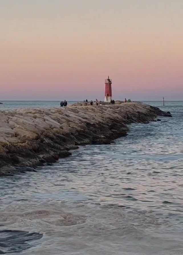 distant view of a lighthouse at sunset. The lighthouse is painted with red and white stripes and stands at the end of a rocky pier jutting into the sea. The sky is a blend of soft pink and light blue colors, indicating the time of day. Several people are standing or sitting on the pier near the lighthouse. The sea in the foreground has small, gentle waves approaching the shore.