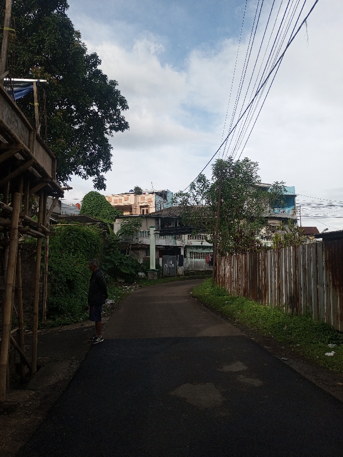 A narrow, newly paved road winds through a residential area. Buildings are seen in the background, partially obscured by lush greenery. An older man in casual clothing stands on the left side of the road. A bamboo structure is next to him. A weathered, corrugated metal fence lines the right side of the road. Power lines crisscross the sky above, contributing to the scene's cluttered urban atmosphere. The sky is overcast.