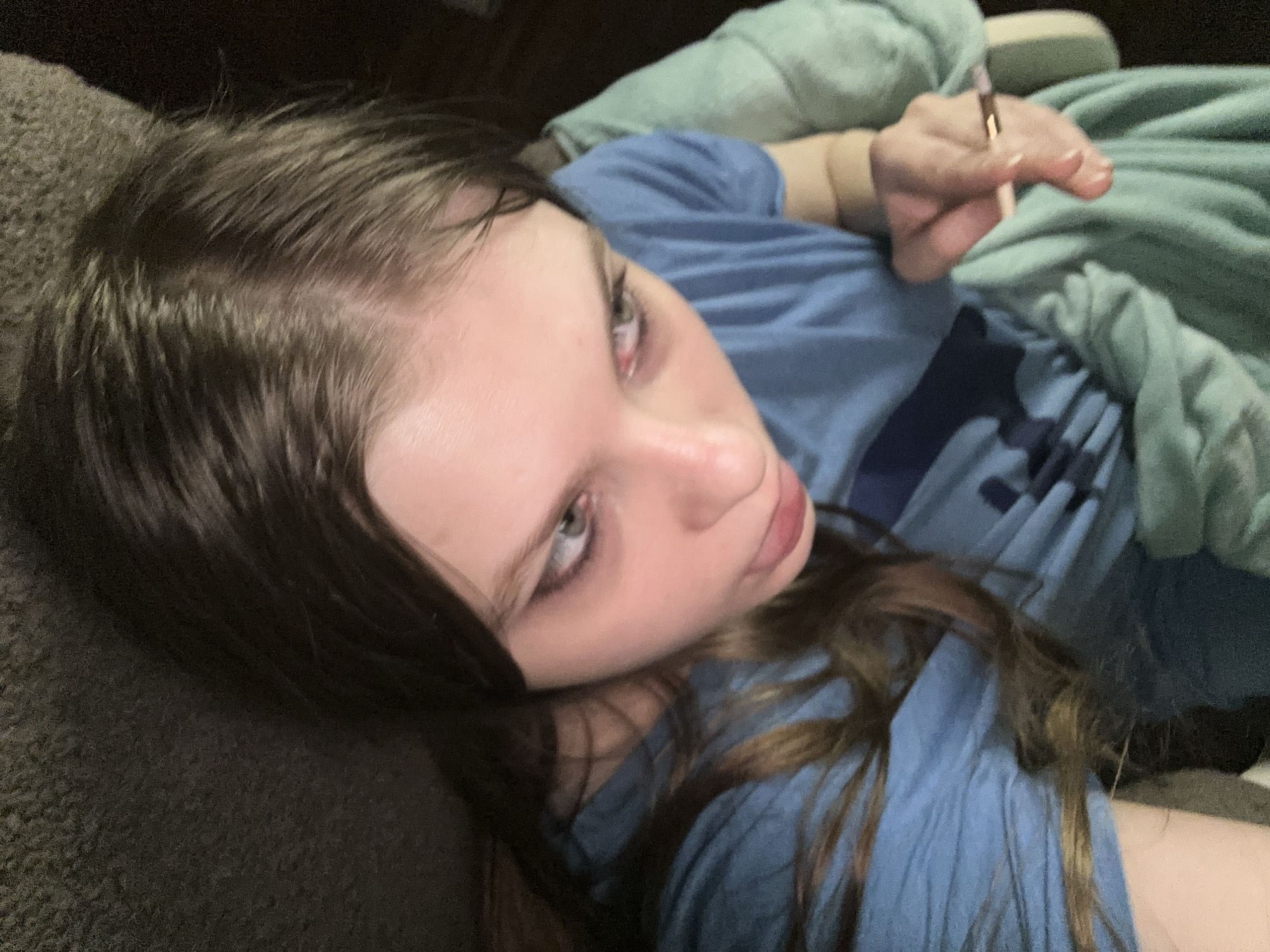 A young person with brown hair and fair skin is lying on a dark gray sofa, wearing a blue shirt