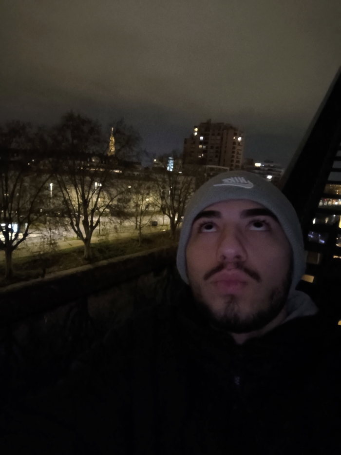 A man wearing a grey Nike beanie and dark jacket looks upwards. Behind him, a city skyline is visible at night, with trees lining a street. A tall building with lit windows stands prominently, and a spire can be seen in the distance. Dark clouds obscure the sky. Part of a bridge or railing frames the right side of the image. The scene is dimly lit.
