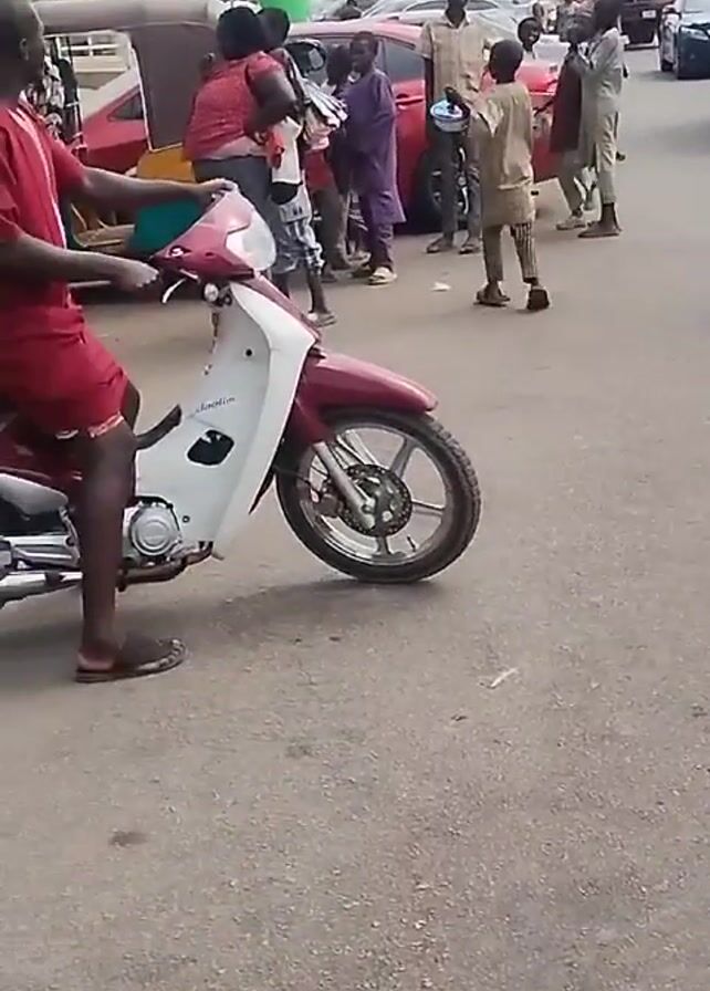 busy street scene, likely in an urban area in Africa. Several people are walking around, some are standing and talking. There is a small motorcycle parked, and another being driven. A line has formed near a booth with a sign that has a spinning wheel, suggesting a game or promotion. There are various vehicles in the background, including cars, a van, and a small three-wheeled vehicle. The video is shot from a handheld camera and captures the everyday activity of the street.