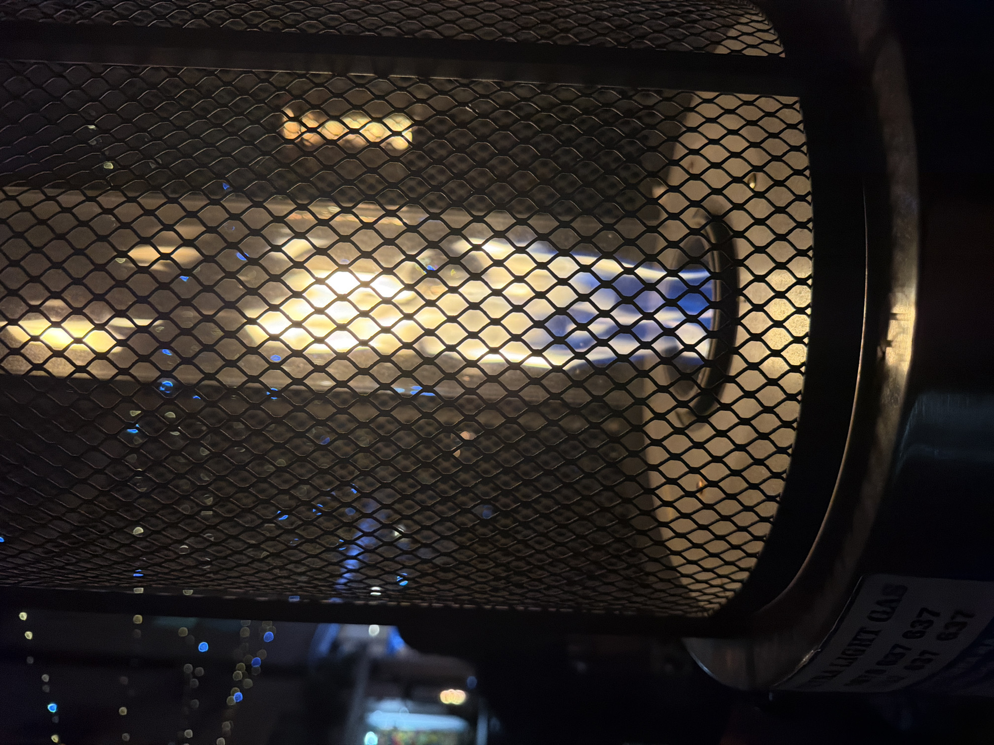 close-up of a gas heater with a protective metal grid in Plovdiv, Bulgaria. Through the grid, a bright yellow and blue flame is visible. The heater appears to be cylindrical with a metal casing, and a label with text including "ULTRA LIGHT GAS" and a series of numbers ("637 637 637") is partially visible on the right side. The background is dark, with some blurred lights suggesting an outdoor setting at night. The heater seems to be the primary source of light in the immediate vicinity.