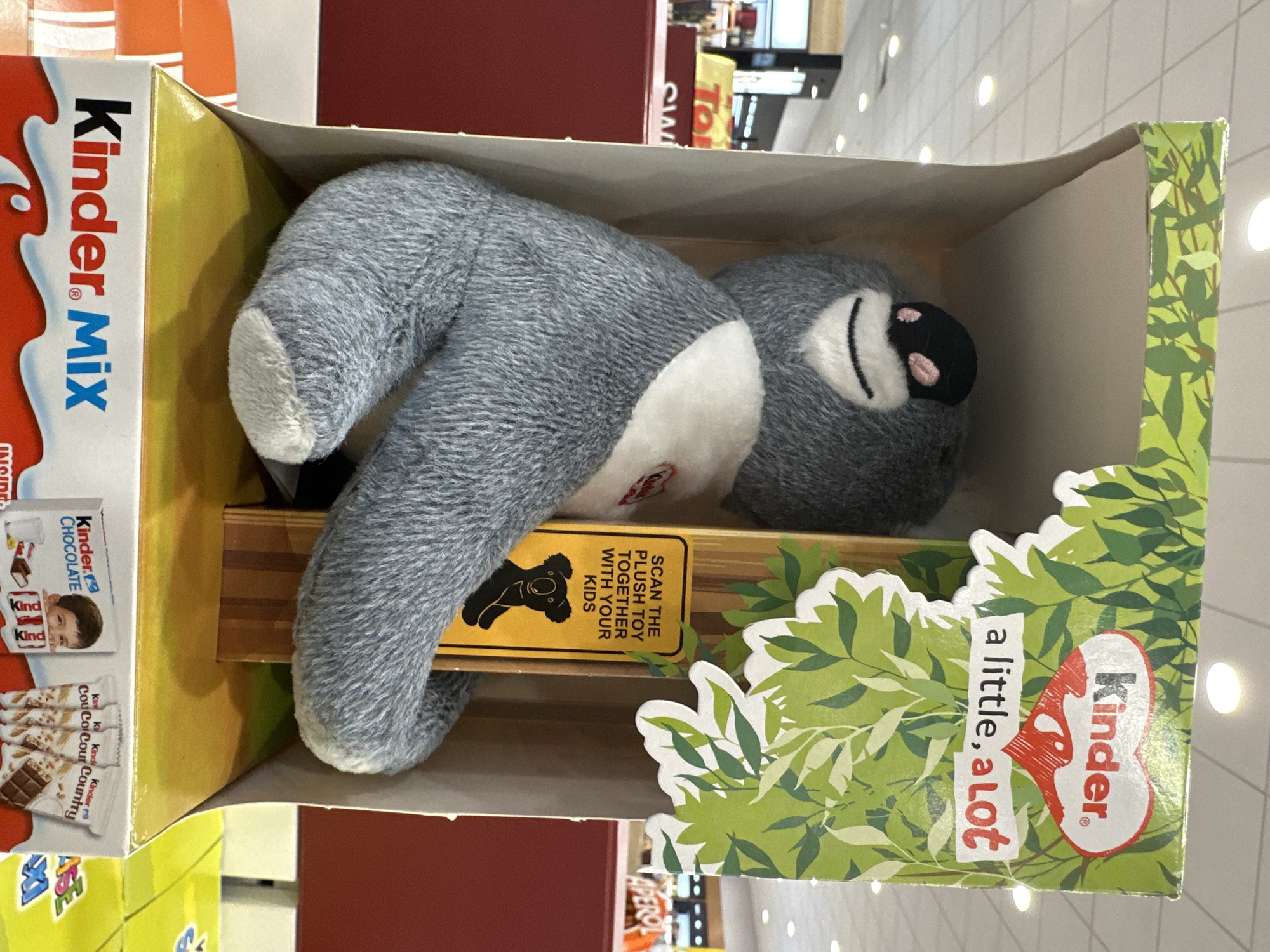Kinder Mix box containing a gray plush koala toy with a white belly and a black nose. The box is decorated with green leaves and the Kinder logo. A yellow sign on the box reads, "SCAN THE PLUSH TOY TOGETHER WITH YOUR KIDS." The background is blurred, but it appears to be a store or retail setting. The location is unknown, and there is no indication of Kulata, Bulgaria.