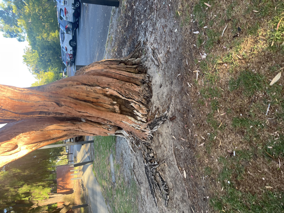 This image depicts an outdoor scene in Applecross, Australia, featuring a prominent tree in the foreground, adjacent to both a paved pathway and a parking lot. In the immediate foreground, the ground consists of sparse green grass mixed with dry brown patches, sandy soil, and scattered leaf litter. A large tree occupies the central and right foreground, its thick trunk exhibiting reddish-brown, deeply textured bark with vertical grooves and some lighter, possibly peeled, areas, particularly at the base. Prominent, dark-colored surface roots extend from the base of the tree into the surrounding sandy earth. To the left of the tree, a light-colored paved pathway curves towards the upper-left. Several dark-colored, upright bollards are positioned along the edge of this pathway. Further back along the pathway, a light-colored metal bench is visible, beyond which stands a low structure of reddish-brown brick. Various other trees with green foliage line the pathway and occupy the background on this side. To the right of the central tree, an asphalt parking lot is present, containing multiple parked passenger vehicles, including several SUVs, in colors such as white, silver, grey, and dark blue. Dark-colored bollards also demarcate the edge of the parking lot. The scene is illuminated by natural light, casting long shadows across the ground and pathway from the left side of the frame, indicating a low sun angle. No individuals are visible in the scene.