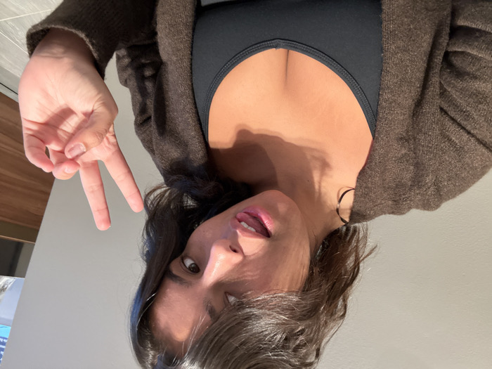 A selfie-style image depicts a young adult female with dark, wavy hair and tan complexion, visible from the chest up