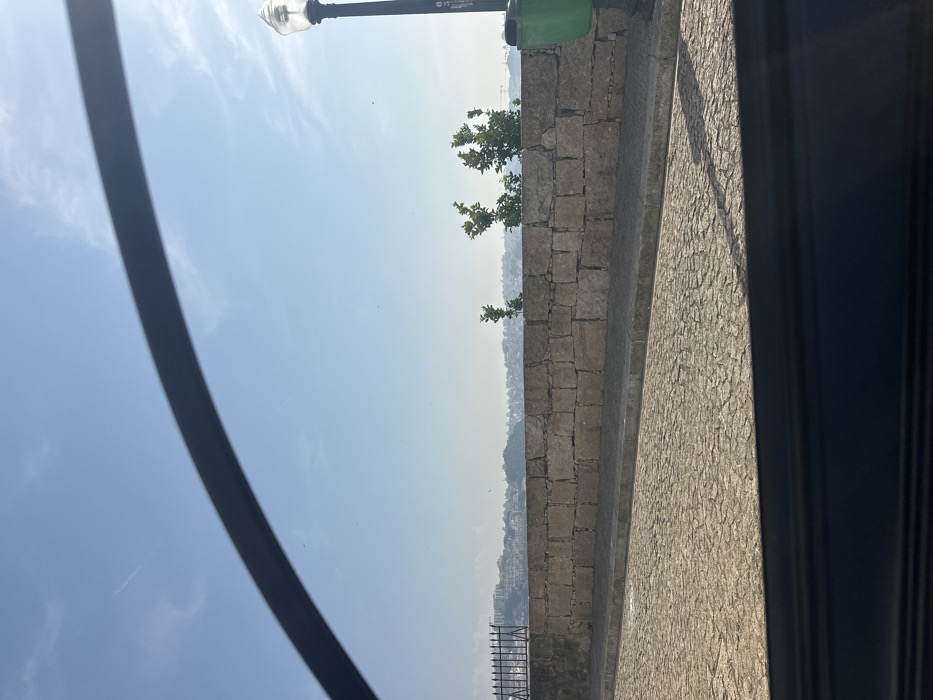 The image displays a daytime outdoor scene, captured through a vehicle window and partially framed by a dark, curved interior component at the top and bottom. The foreground features a light-brown cobbled street, bordered by a narrow concrete curb. Beyond the curb, a substantial, light-gray stone retaining wall, constructed from large, rough-hewn blocks, extends horizontally. To the right, a black street lamp post with a clear, bell-shaped luminaire stands, featuring a dark green public waste bin attached to its lower section. Behind the wall, several small, green-leafed trees are visible, and a segment of a dark metal railing is present atop the wall on the left. The background reveals a distant urban landscape of light-colored buildings stretching across a river or valley, set against a clear, light-blue sky with sparse wispy clouds and a faint aircraft contrail in the upper left. The environment is brightly illuminated by natural sunlight, casting distinct shadows on the cobbled surface. This view is consistent with a riverside area within Lordelo do Ouro e Massarelos, Porto, Portugal, offering a panorama across the Douro River. No individuals or direct interactions are depicted.