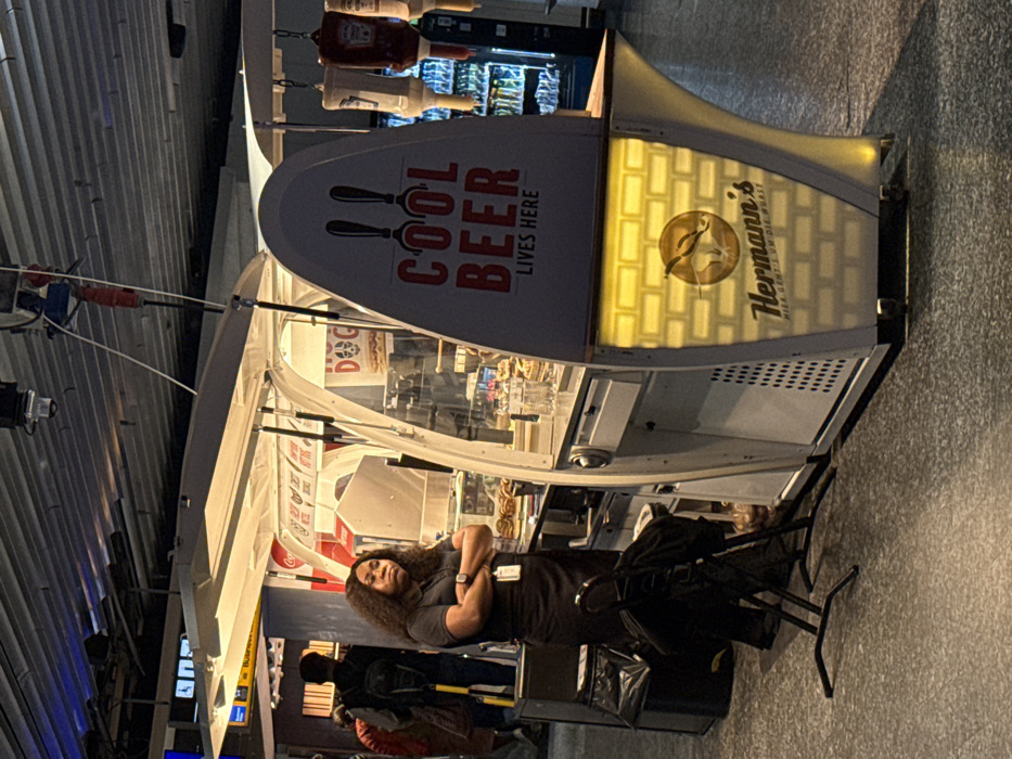 This image depicts an indoor food stall named "Hermann's" located in Frankfurt Airport (FRA), specifically Terminal 1, Level B (B-Ebene). A Black female individual, presumably an employee, stands to the left of the stall. She wears a dark polo shirt, a dark skirt, a dark apron, and a watch on her left wrist, with an ID card clipped to her attire. Her arms are crossed, and she looks towards the right with a neutral expression. Behind her, a black trash can and a black foldable chair with a bag are visible. The white food stall features a display counter with various food items, including what appear to be hot dogs and pastries. One section of the stall displays "COOL BEER LIVES HERE" in red text with fork and knife icons. Below this, an illuminated panel resembling a brick wall shows the "Hermann's" logo with a leaping animal silhouette and the German text "HIER GEHT'S UM DIE WURST" (Here it's about the sausage). To the right, several hanging condiment dispensers (ketchup, mustard, mayonnaise) are visible, alongside a refrigerated display unit. The environment is a large public concourse with a high, industrial-style ceiling, visible beams, lighting fixtures, and what appears to be a security camera. The floor is dark grey and tiled. In the blurred background, other individuals and airport signage confirming "FRA", "TERMINAL 1", and "B-EBENE" are discernible.