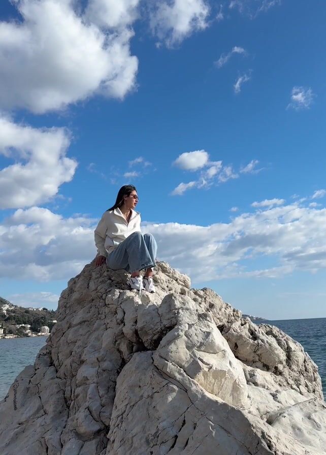 A woman is sitting on a large rock by the sea. She is wearing a white sweatshirt, blue jeans, and white sneakers, and she has sunglasses on. The sky is blue with white clouds. There are buildings visible in the distance to the left, and the sea is to the right. The woman is looking to the right. The camera zooms in slightly on the woman.