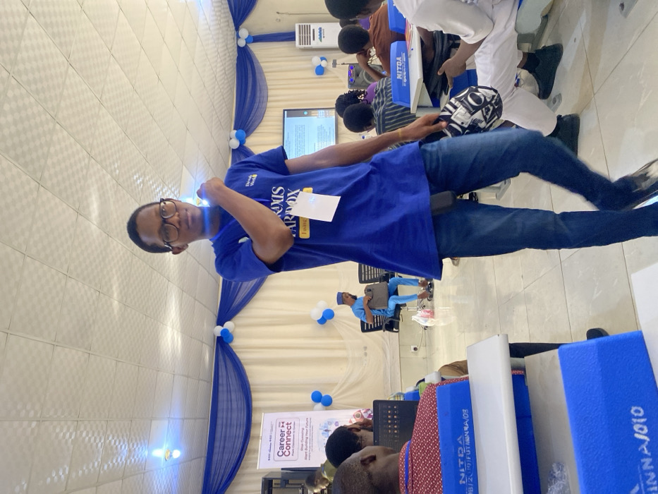 The image depicts an indoor event occurring in a hall located in the city of Baganakwo, Nigeria. The hall's interior features a dropped ceiling with a checkered pattern and multiple recessed lights. Walls are adorned with blue and white fabric drapes and matching balloons. A large projector screen displaying white text on a dark background is visible on the back wall, to the right of a vertical "Career Connect" banner. An air conditioning unit is mounted on the right wall. In the foreground, a young adult male with dark skin and short dark hair, wearing glasses, a royal blue t-shirt with "PRAXIS PARADOX" printed in white, blue denim jeans, and dark shoes, stands facing slightly right of the camera. He holds an illuminated, elongated object with his right hand near his chest and a black-and-white patterned cap in his left hand. A white ID badge on a blue lanyard hangs around his neck, and a dark mobile phone is clipped to his right hip. In the mid-ground, several individuals, predominantly young adults, are seated at white desks with blue fronts. Some desks bear inscriptions such as "NITDA" and alphanumeric codes including "FUTMINNA/03" and "INNA/010." Some attendees are observed looking at laptops or towards the front of the hall. On a slightly raised platform at the rear of the room, a man in light blue traditional Nigerian attire (a matching cap and tunic) is seated on a black chair, looking down at an open brown briefcase on the floor in front of him.