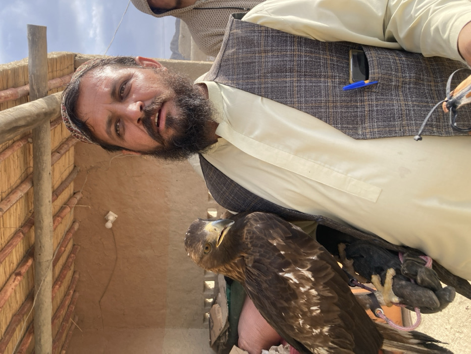 The image depicts an outdoor or semi-sheltered area in Qilla Saifullah, Pakistan. A bearded adult male, wearing a light-colored long-sleeved shirt, a plaid vest, and a traditional cap, occupies the central foreground. He has a dark-colored smartphone and a blue pen in his left vest pocket. He looks towards the upper right, with his mouth slightly ajar. On his gloved left arm, a large dark brown raptor, identified as an eagle, is perched. The eagle has prominent yellow eyes and a yellow beak with a dark tip; its talons are visible gripping the black falconry glove. A pinkish tether is secured around the eagle's leg, connecting it to the glove. In the lower right corner, a falconry lure or hood, with brown and white patterns, is partially visible. In the upper right background, another individual wearing a light-colored hooded garment is partially visible. The immediate background consists of a light brown mud or adobe wall, showing cracks, with a white electrical outlet and a single light bulb socket mounted on it. Overhead, a rustic roof constructed from wooden beams and woven reed or straw matting is visible. Distant hills or mountains are discernible under a partially cloudy sky.
