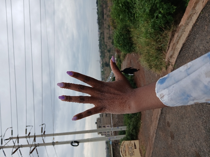 The image depicts an outdoor environment in Witeithie ward, Kenya, under a uniformly overcast sky. In the foreground, a dark-skinned right hand and forearm are raised vertically, with the palm facing the camera. The fingernails are painted light purple, with some exhibiting a glitter finish. The forearm is covered by a sleeve featuring a blue and white patterned fabric. A dark paved road curves across the lower portion of the frame, bordered by a concrete curb on the right. A dirt path branches to the left, descending past a light-colored signpost with partially legible text, including "WITEITHIE." In the midground, a person dressed in dark clothing walks away from the camera, following the dirt path. A tall utility pole with multiple overhead power lines is visible on the left, with multi-story buildings discernible behind it. The midground and background consist of green vegetation, leading to a distant, undulating landscape.