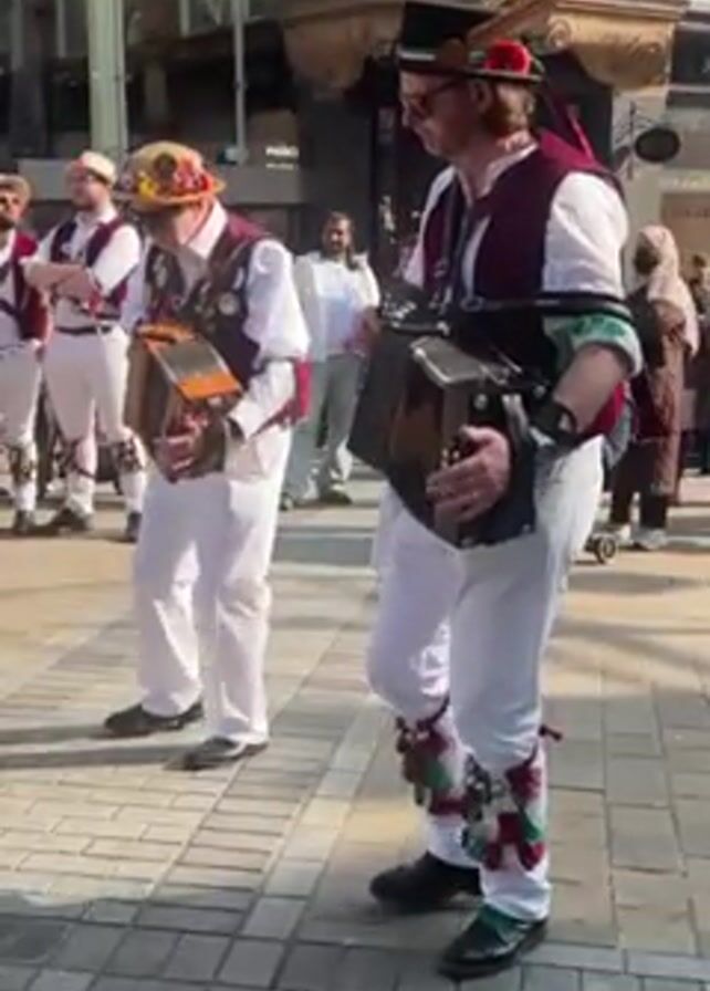 group of men dressed in traditional costumes playing musical instruments in a public square. The men are wearing white trousers and shirts, with vests and decorative leg coverings. They are playing what appear to be concertinas, and the sound of the music can be heard. Some of the men are wearing hats, and one has a feather in his hat. The group is standing on a brick-paved area in front of buildings with storefronts. There are other people in the background, including some watching the performance. The lighting suggests it is daytime.