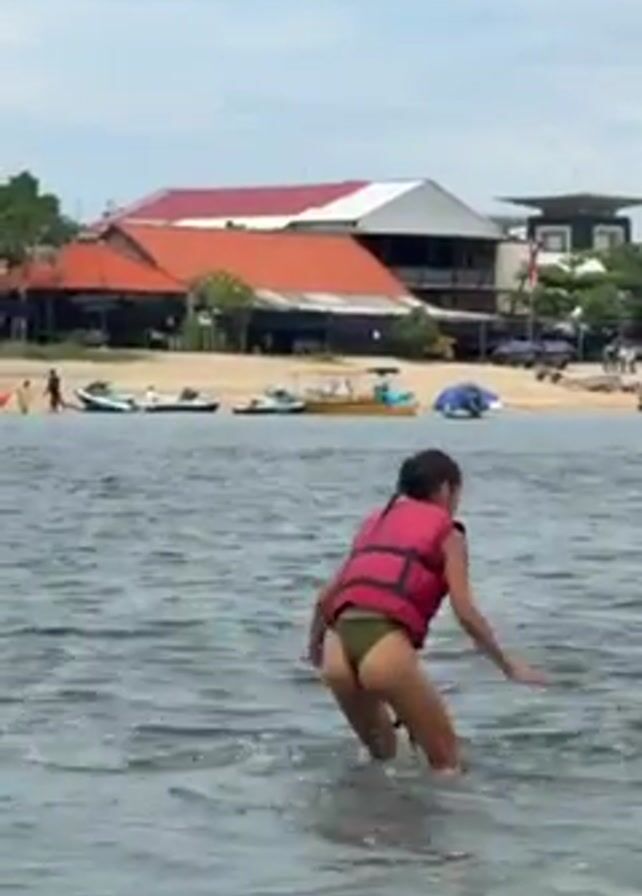A woman wearing a pink life vest and a two-piece bathing suit attempts to hydrofoil on the water. She is standing in shallow water and holding a rope that is attached to a boat that is out of frame. The boat accelerates and pulls her forward, but she falls and splashes into the water. The location is a beach with boats, kayaks, and other recreational equipment present.
