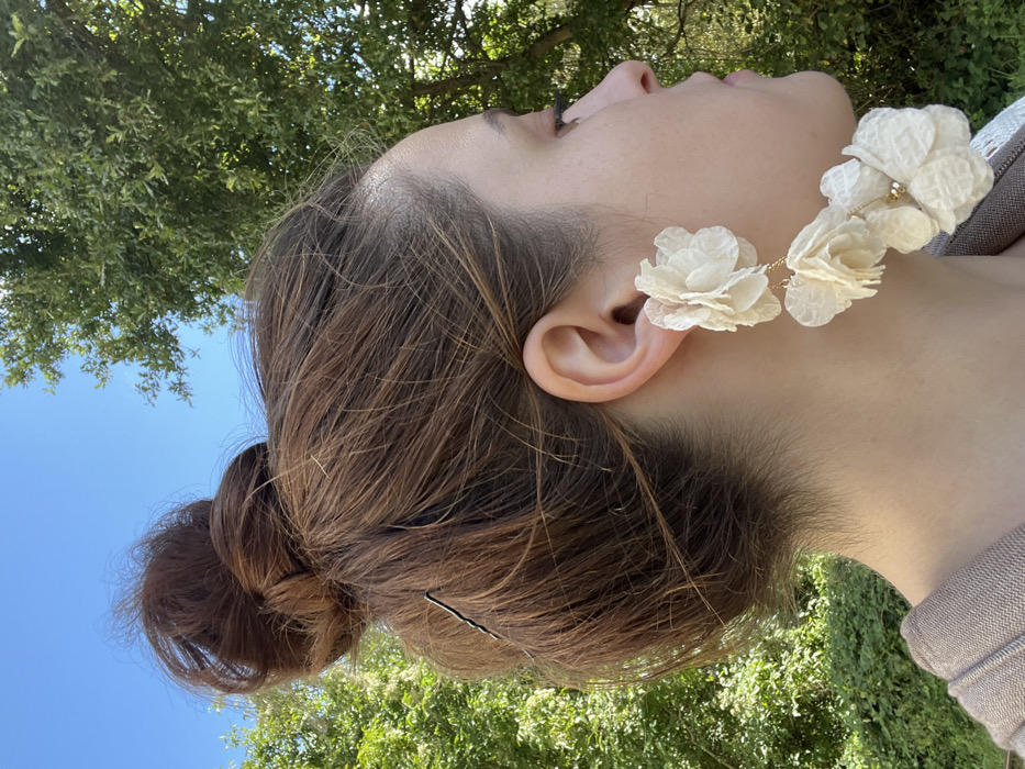 A close-up, profile image captures the right side of a female subject's head and upper torso, set against a background of green foliage and a clear blue sky in Odernheim am Glan, Germany. The subject's auburn hair is styled in a high, messy bun, secured with a single black bobby pin visible on the left side of the bun. A multi-tiered dangle earring is visible on her right ear, featuring three light-colored, crinkled fabric flowers connected by thin gold-colored chains. The subject's right ear is exposed, and her right shoulder is partially visible, clad in a textured, light-colored garment. The natural light suggests an outdoor setting during daytime hours.