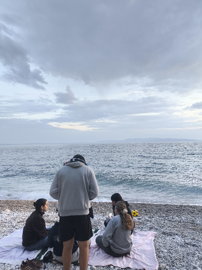 Four individuals are observed on a pebble beach in Grad Rijeka, Croatia, under an overcast sky. The scene depicts the Adriatic Sea with visible landmasses on the distant horizon, consistent with a coastal environment. One male individual stands with his back to the camera, positioned centrally, wearing a grey hooded sweatshirt and dark shorts. He has a dark scarf or material around his neck. Three other individuals are seated on two separate blankets on the pebble shore. To the left, a female with dark hair is seated on a white blanket, facing towards the right side of the frame. She wears a dark long-sleeved top and dark pants. A pair of brown Adidas sneakers are visible on the pebbles near her. To the right, two individuals are seated on a light pink blanket. One female, with light brown hair in a ponytail, is seated facing away from the camera, wearing a grey sweatshirt and dark pants. Adjacent to her, a fourth individual, partially obscured and wearing dark clothing, is seated facing towards the left. A yellow and black soccer ball is visible on the pebbles behind the two individuals seated on the right. The sea features moderate ripples and small waves breaking onto the pebble beach. The sky is predominantly grey with layered clouds, indicating an overcast condition or late afternoon/dusk lighting.