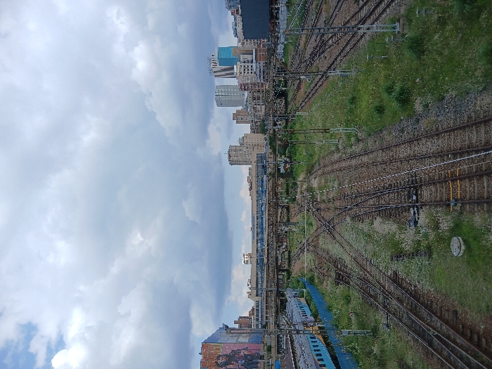 The image displays a network of railway tracks extending into the distance. Urban buildings are visible on the left side of the frame, positioned beyond the tracks. The sky is filled with white and gray clouds, taking up a significant portion of the image. The railway area is covered in green grass and some gravel. The perspective gives a sense of depth as the tracks converge towards the horizon amidst the cityscape.