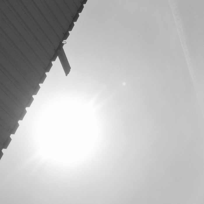 The image presents a monochrome, upward-angled view of a bright sky and an architectural overhang