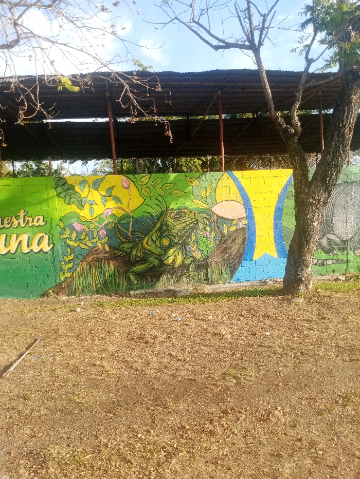 This image depicts an outdoor scene in Tinaquillo, Venezuela, featuring a painted wall, sparse ground, and background structures under a clear sky. The prominent subject is a concrete block wall extending across the midground, adorned with a vibrant mural. The mural on the left section is painted bright green with partial yellow text reading "Nuestra una" (likely "Nuestra Fauna"). The central portion of the mural features a detailed green iguana, rendered with scales and a yellow underside, positioned on a brown log amidst dense green and yellow foliage with pink flowers. To the right of the iguana, the mural transitions into a section with abstract yellow and blue vertical shapes against a light blue background. Further to the right, a gray mural depicting a portion of an armadillo is partially visible. In the foreground, the ground is covered with dry, sparse brown grass and scattered small debris, including white and blue plastic pieces and a long, light-colored stick on the left. A tree with a textured brown trunk and mostly bare branches stands in the middle-right foreground, partially obscuring the mural. Another tree with thinner, bare branches is visible in the upper-left, extending against the sky. Behind the mural wall, a large, open-sided structure with a dark, corrugated metal roof is visible. This structure is supported by multiple reddish-brown metal poles. Barbed wire fencing runs along the top of the wall below the background structure. The sky above is a light blue with scattered white clouds, indicating clear daytime conditions with bright natural lighting. No individuals or animals are present in the immediate scene.