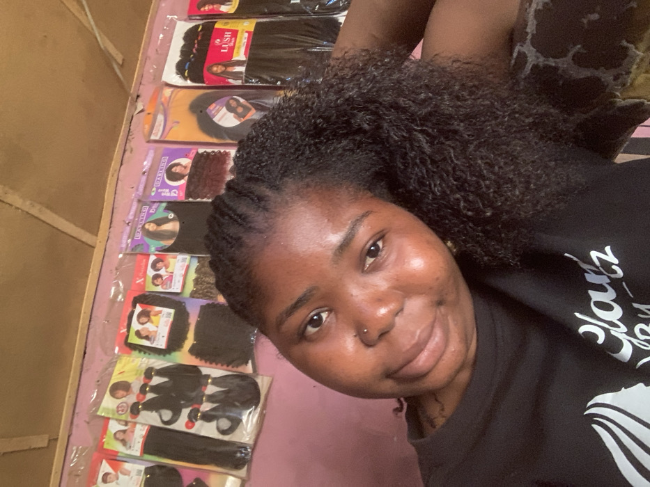 An indoor portrait taken in Garaku, Nigeria, depicts a young adult female positioned in the foreground, slightly tilted towards the viewer. She has dark skin, dark curly hair, and a small silver piercing on her right nostril. She wears a dark t-shirt with a partially visible white graphic featuring the text "Glamz" and a female silhouette. Her expression is a slight smile, and her gaze is directed at the camera. Her right arm rests on a patterned surface with dark and light brown mottled fabric. The background reveals a light pink wall adorned with multiple packaged hair extensions and wigs of varying styles and colors. Brands such as "DARLING" and "LUSH" are visible on some packages, which are displayed hanging from hooks or strings. Above the displayed products, a light-colored wooden beam is visible, indicating an interior structural element.