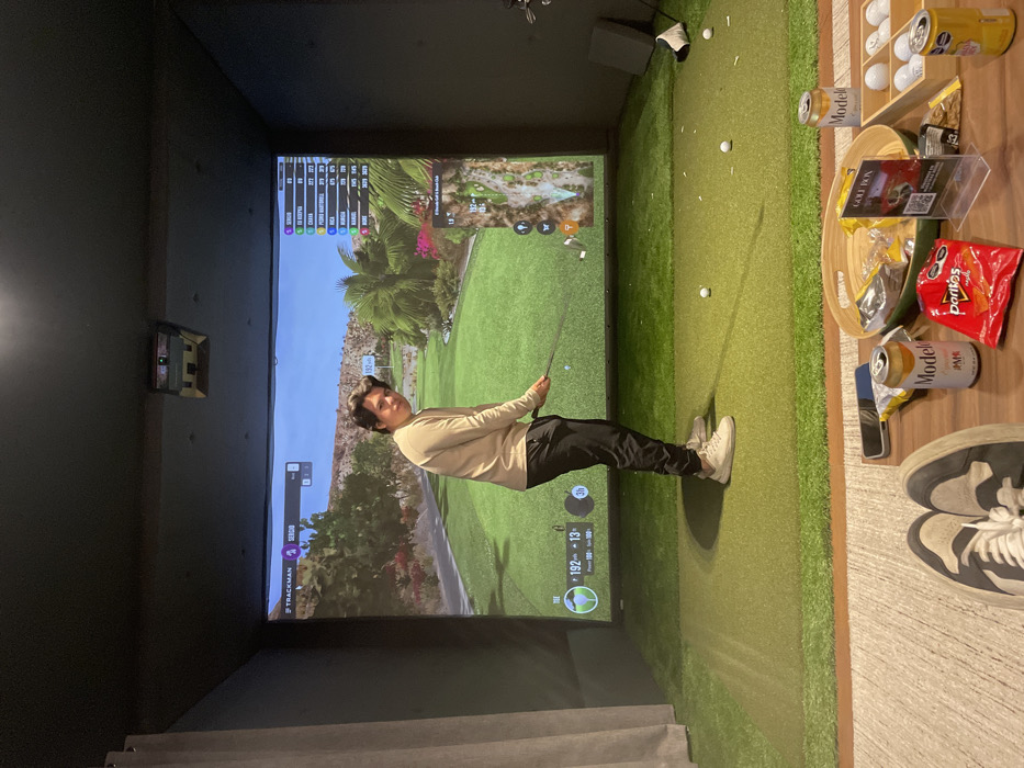 This image depicts an indoor golf simulator bay located in La Purísima, Mexico