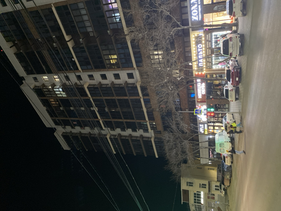 A tall building dominates the frame, its many windows reflecting light. Electrical wires stretch across the foreground. A street runs alongside the building, lined with shops and parked cars. Bare trees stand between the building and the street. The sky is dark, suggesting it's night. People are visible near a white van.