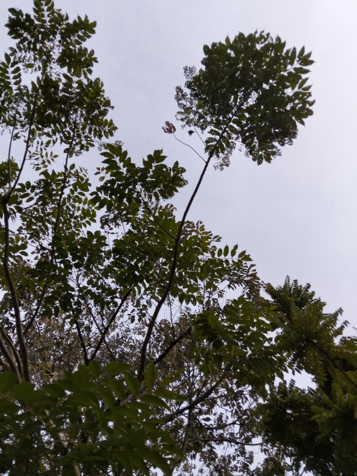 This image depicts an upward view into the canopy of several trees in the city of Panton, Indonesia. The sky occupies the upper portion of the frame, appearing overcast with a uniform light grey-white tone, indicating diffused light conditions. Multiple tree branches, bearing predominantly dark green, compound leaves, extend from the lower and mid-sections of the image towards the sky. Some leaves exhibit minor irregularities or holes, consistent with insect damage. A few isolated leaves higher in the canopy show reddish-brown or lighter green discoloration. The branches are visible as dark, slender structures silhouetted against the bright sky. No people, animals, or man-made structures are present in the scene.