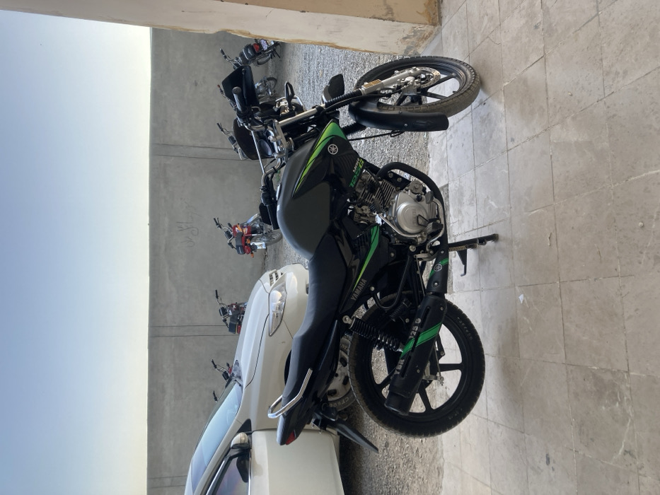 The scene depicts an outdoor parking area in Quetta City Tehsil, Pakistan, under a clear, light blue sky. In the immediate foreground, a dark grey and black Yamaha YBR 125G motorcycle, featuring green decorative stripes on its fuel tank, side panels, and exhaust heat shield, is parked on a light-colored tiled surface, resting on its kickstand. Its front wheel is slightly turned to the left. Behind and to the left of the primary motorcycle, the front passenger side of a light-colored sedan is partially visible. Further back, on a dirt and gravel surface, at least five additional motorcycles, including red and darker models, are parked against a long, unpainted light grey concrete wall. Faint, illegible script is visible on the concrete wall. A light-colored concrete pillar or wall section partially frames the right side of the image. No individuals are present in the scene; all vehicles are stationary.