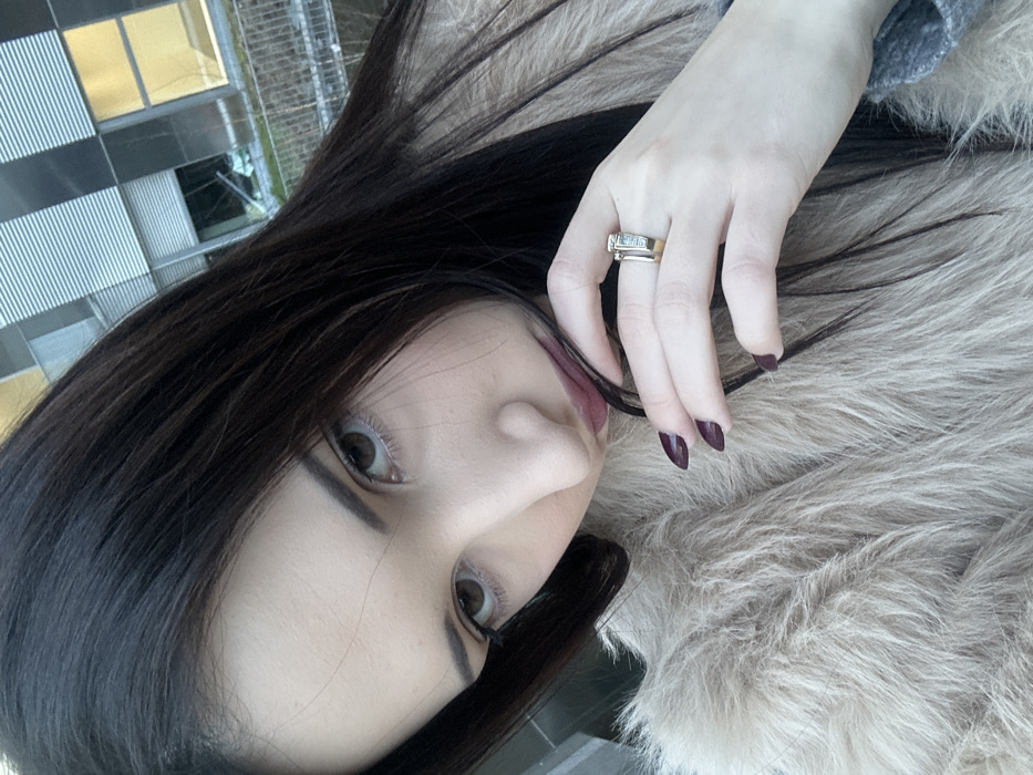 A person with long, dark hair and bold eye makeup poses in a close-up shot. They wear a gold ring and have dark-colored nails. The background features a furry coat, and a building is partially visible through a window. The person appears to be holding their hair with their hand near their mouth, giving a unique perspective.