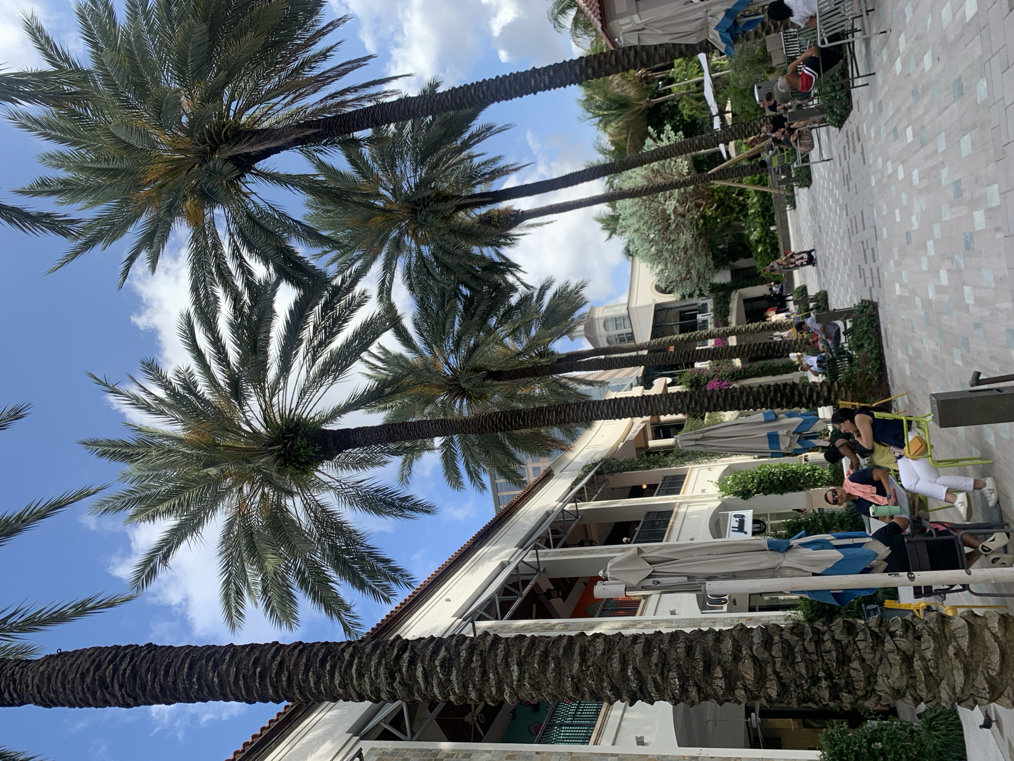 The image depicts an outdoor scene in West Palm Beach, Florida, United States of America, featuring a row of palm trees lining a pedestrian walkway. The view is from a low angle, looking upwards towards the sky and the palm trees' canopies. The sky is blue with scattered white clouds. On the right side of the walkway, there are people seated at tables under large umbrellas. Some of these individuals are interacting with each other, while others appear to be relaxing or looking at their phones. The architecture of a multi-story building is visible behind the palm trees and the seating area. The building has a white facade with a red-tiled roof. The pathway is paved with a pattern of light-colored tiles.