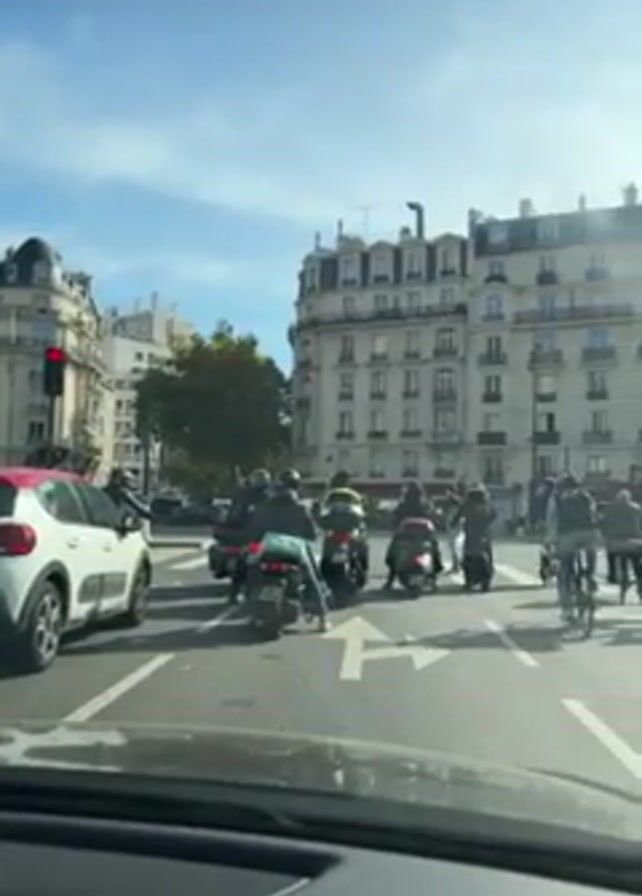 The video, recorded from a car's dashboard camera, shows a street in Paris. It focuses on a group of motorcyclists and scooter riders stopped at a red light. The light changes, and they prepare to move forward. The scene includes European-style buildings in the background, a white car to the left, and a cyclist. The day is sunny.