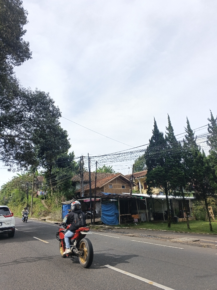 A motorcyclist speeds along an asphalt road marked with a white dividing line. A white car trails behind. On the roadside, a row of tall evergreen trees stands guard next to a weathered structure with blue tarps. Behind it, quaint houses with brown tile roofs nestle amid lush greenery and telephone poles. A partially cloudy sky blankets the scene.