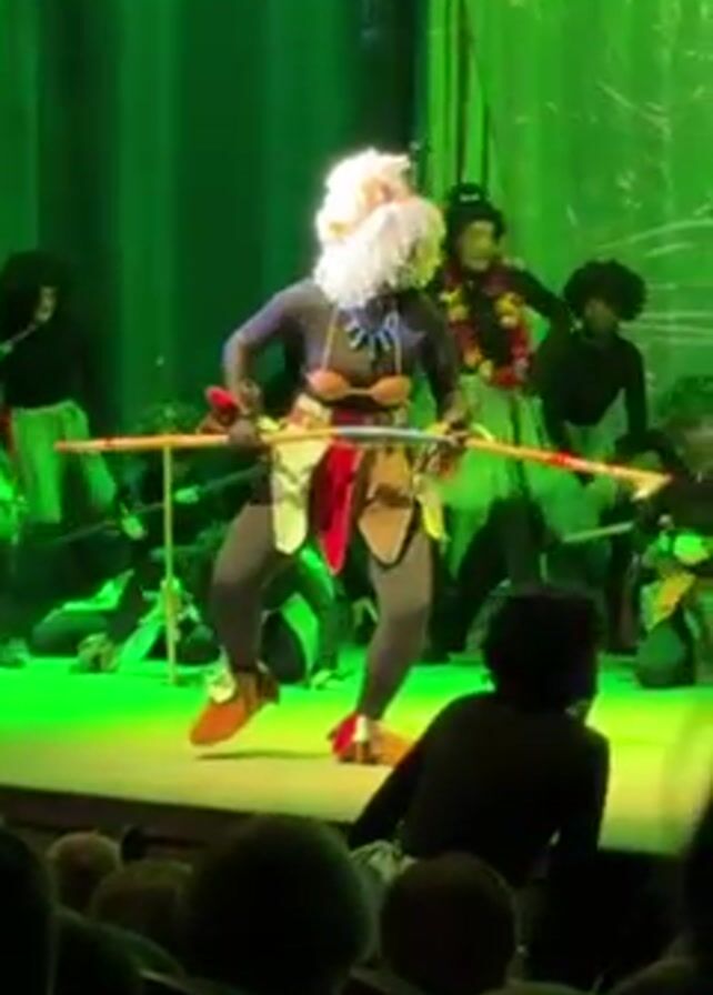 A theater stage lit with green light is the setting for a performance. The backdrop shows a green jungle scene. The foreground shows the backs of audience members in an auditorium. The focal point is a figure in the center of the stage, costumed as a native tribal person. The figure wears a tattered white wig, gray leggings and shirt, and brown shoes. The figure is holding a colorfully decorated pole. Behind this figure, other performers in black clothing, afro wigs, and green skirts brandish bamboo poles. Several performers are standing, while others are kneeling or crouching.