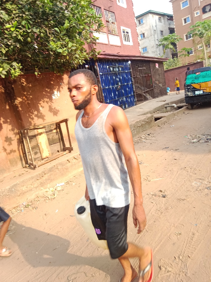 - "A man in a grey tank top and black shorts walks along a dirt road carrying a white container" by FM-z3DGk1, licensed under CC BY 4.0